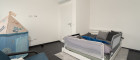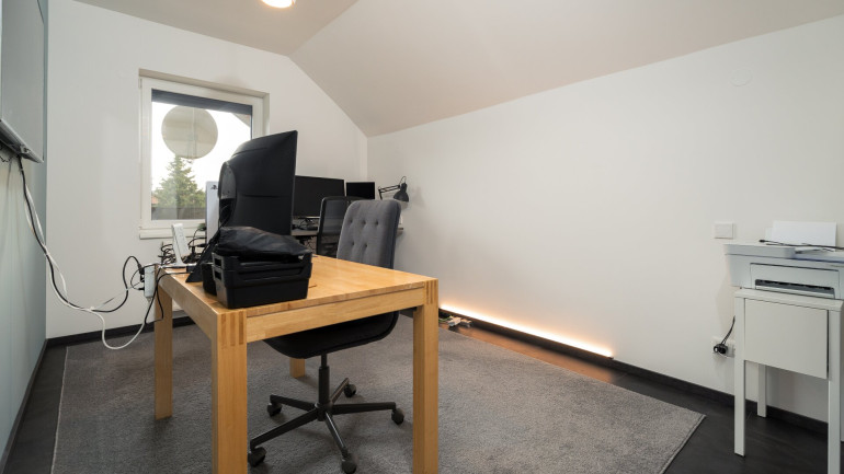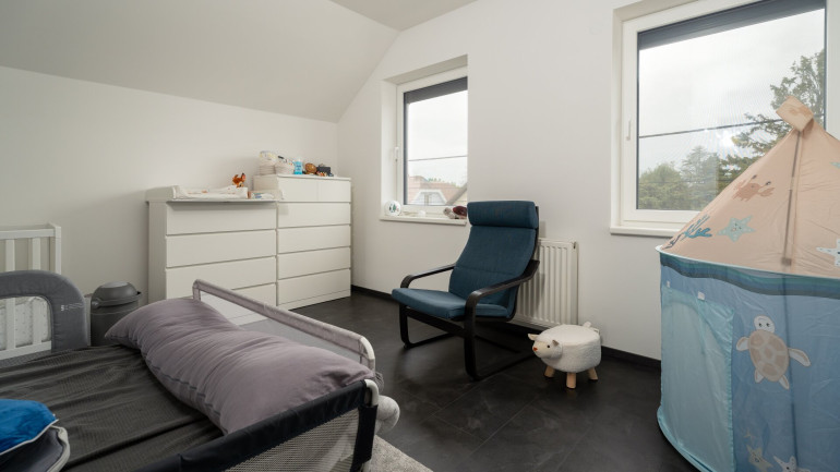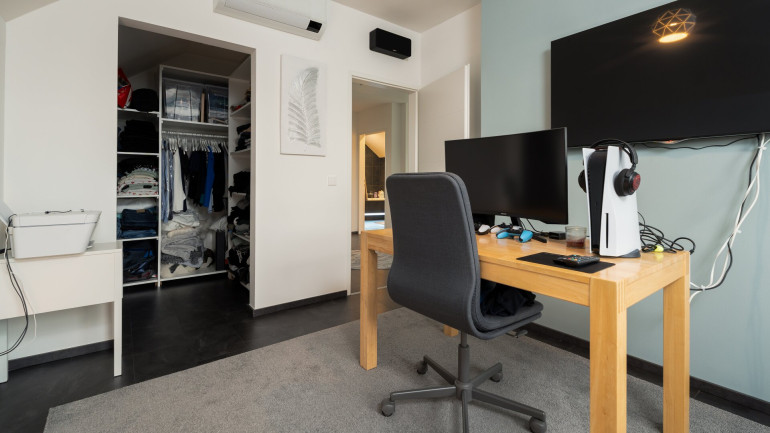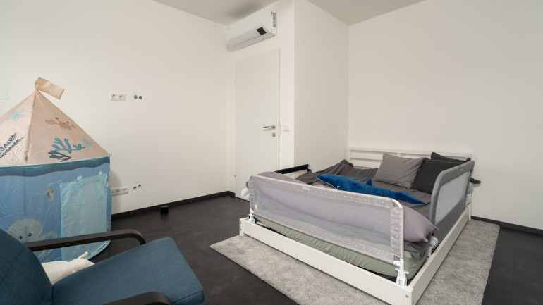 Obergeschoss: ein zentraler Flur erschließt die Räume. Das große Schlafzimmer mit Balkonzugang bietet reichlich Platz. Ein weiteres, kleineres Schlafzimmer (derzeit Büro) verfügt zusätzlich über einen Schrankraum. Das dritte Zimmer wird aktuell als Kinderzimmer genutzt. Das großzügige Badezimmer umfasst Wanne, Dusche, WC und Waschbecken. In allen Schlafzimmern sind Klimageräte verbaut.