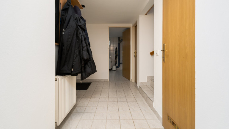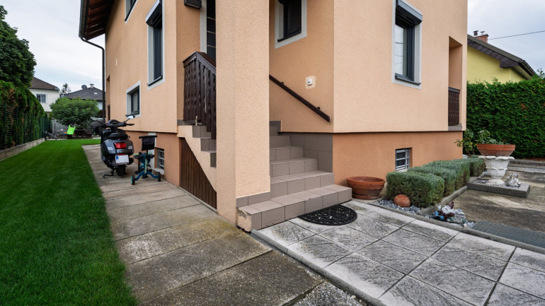 Ein Vorgarten mit KFZ-Abstellplatz bildet den Eingangsbereich. Über ein paar Stufen gelangt man in den Vorraum mit Garderobe. Von hier führt ein zentraler Vorraum, der sowohl den Zugang in den Keller als auch ins Obergeschoss bietet.