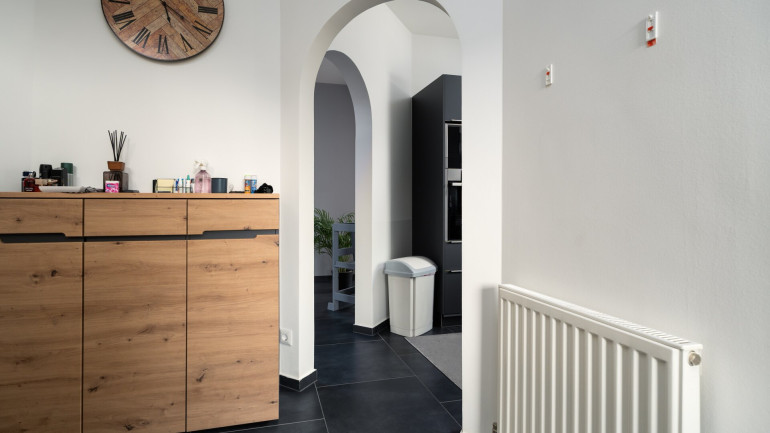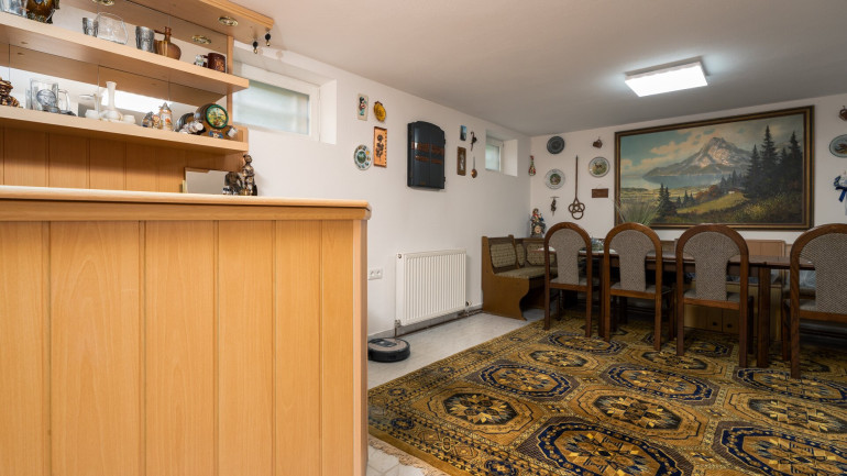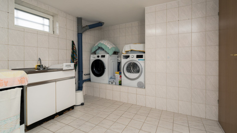 Keller: linkerhand des Abgangs befindet sich ein kleiner Abstellraum unter der Treppe, das Kellerstüberl (mit Soundsystem) sowie ein weiterer Abstellraum in dem sich das Smart Home System und der Sicherungsschrank befinden. Rechterhand liegen ein Hauswirtschaftsraum mit viel Platz für Wäschepflege und der Heizraum mit Warmwasserboiler, Gasheizung und Festbrennstoffofen.