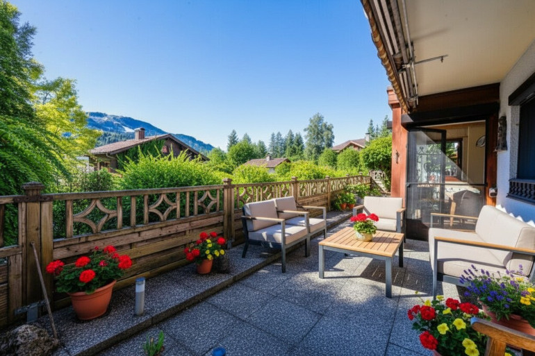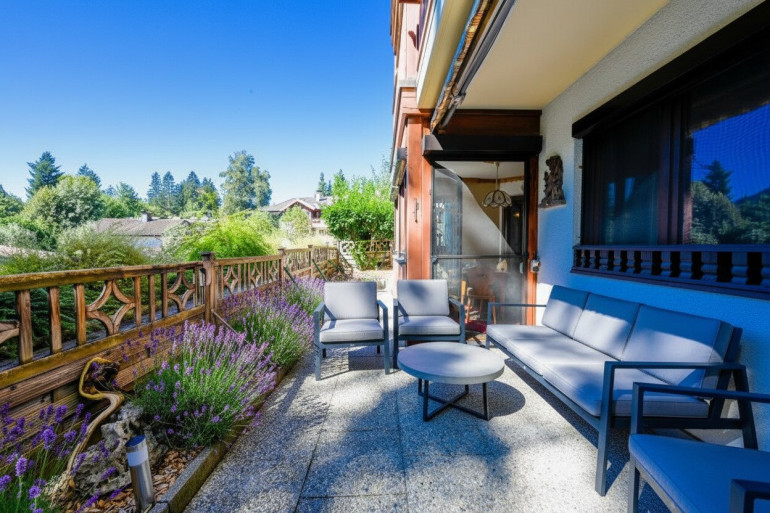 Besonders hervorzuheben ist die großzügige Terrasse, die nach Südwesten ausgerichtet ist. Hier können Sie die Sonne von morgens bis abends genießen und den atemberaubenden Ausblick auf die umliegenden Berge und die grüne Landschaft bewundern. Ob beim Frühstück im Freien oder bei einem Glas Wein am Abend – Ihr neuer Rückzugsort wird zum Lieblingsplatz im Freien. Ein besonderer Platz ist der beheizte Wintergarten, somit steht auch im Winter nichts im Wege, diesen hellen Raum zu nutzen