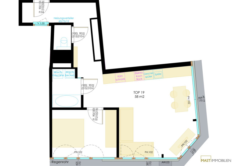 Fliesen, Parkett, Fußbodenheizung, Wohnküche / offene Küche, Personenaufzug, Badewanne