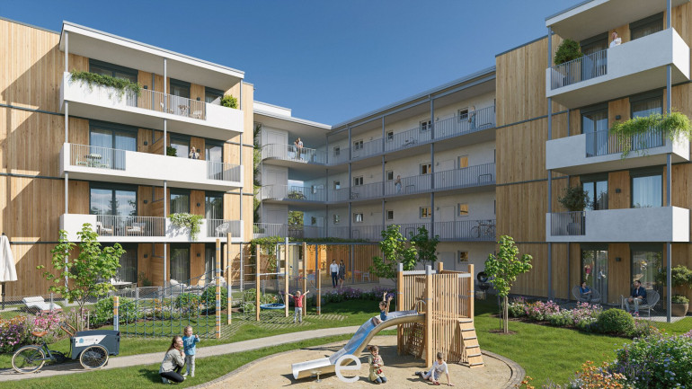 extrabreite Laubengänge und großzügige Grünanlagen mit Kommunikationszone