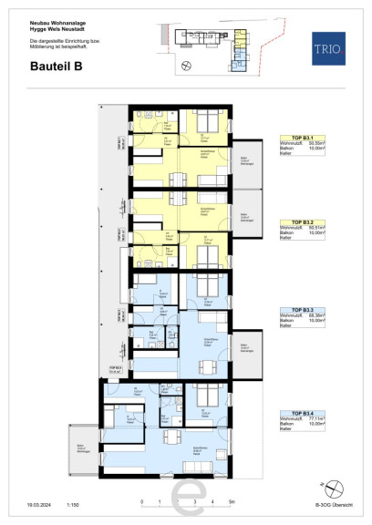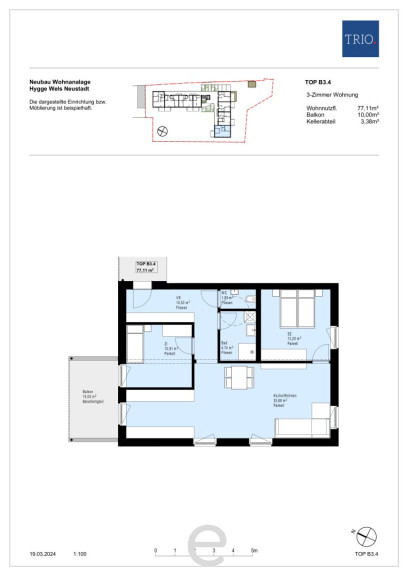 Diese nordwestlich ausgerichtete DG-Wohnung (TOP B3.4) im 3. Obergeschoss bietet auf rd. 77,11m² Wohnfläche eine harmonische Kombination aus moderner Architektur und durchdachter Raumaufteilung. Die großzügigen Fensterflächen lassen viel Tageslicht herein und schaffen ein helles, freundliches Ambiente, das zum Wohlfühlen einlädt.