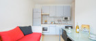 Küche: kompakter Esstisch für zwei bis drei Personen, dazu offene Regale oder Hängeschränke für mehr Stauraum.