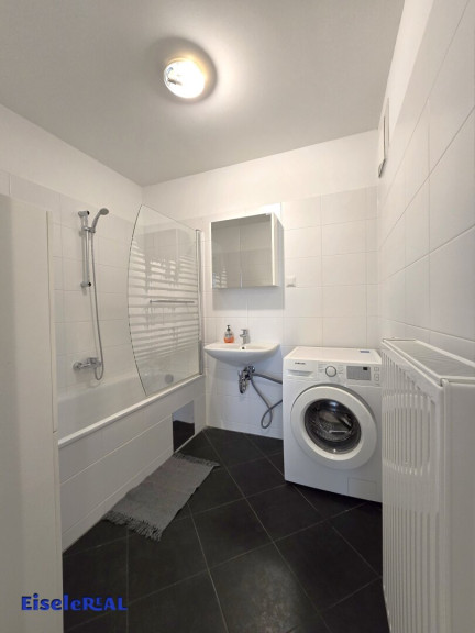 - Badezimmer mit Badewanne, Waschmaschine, und Waschbecken