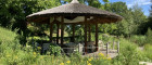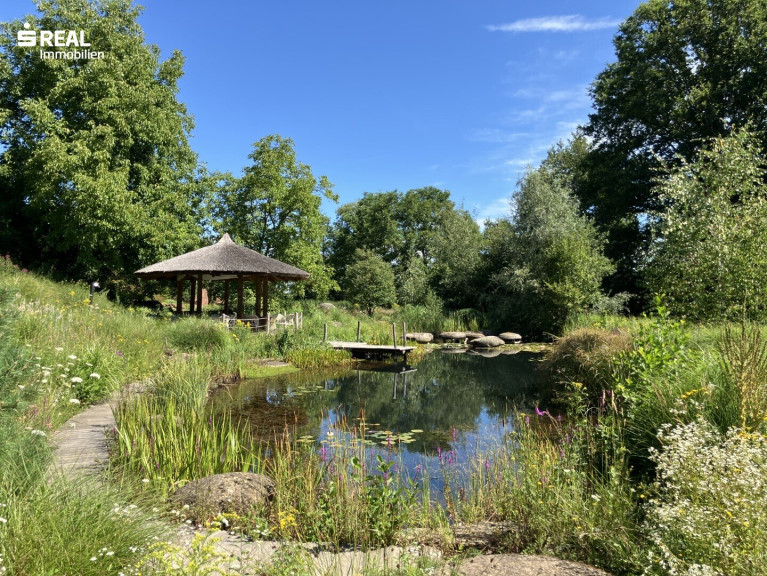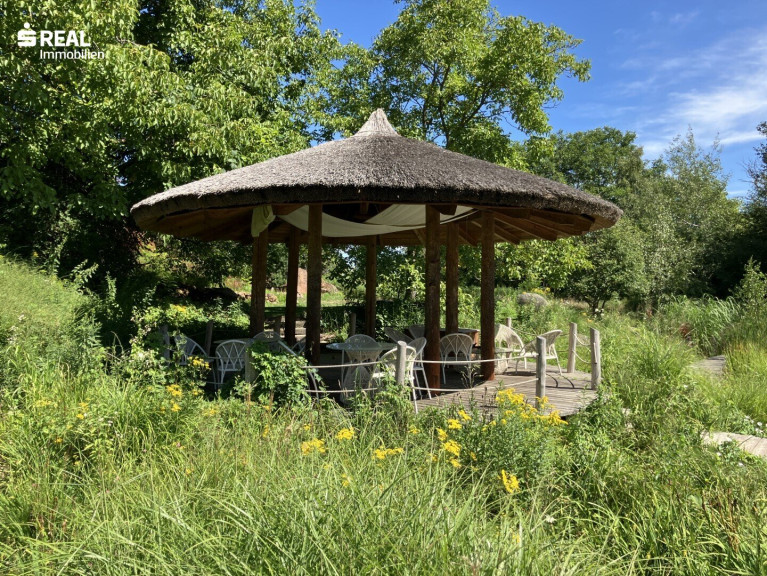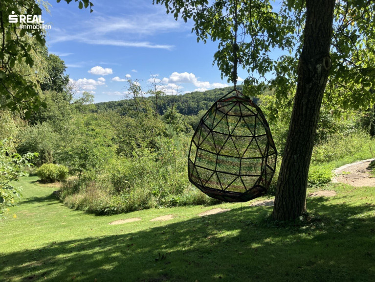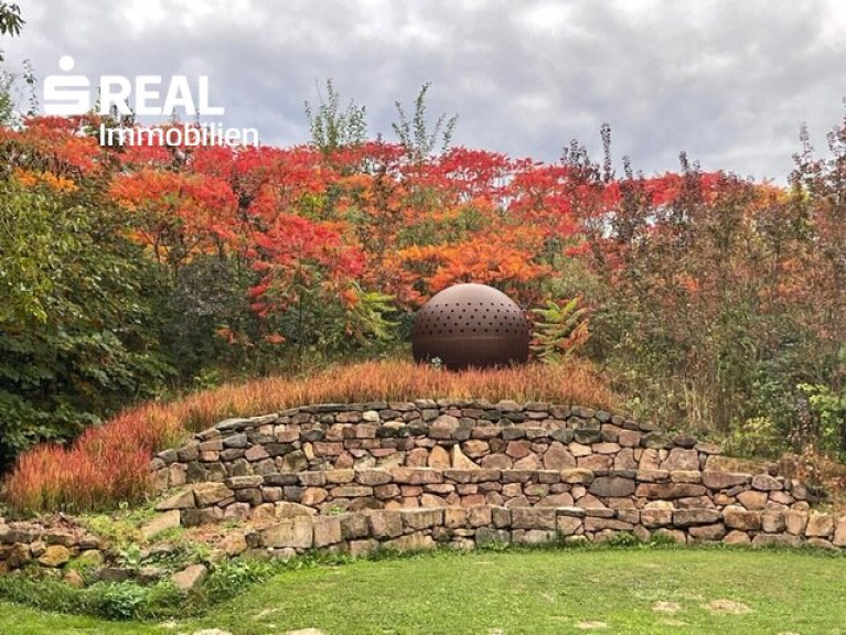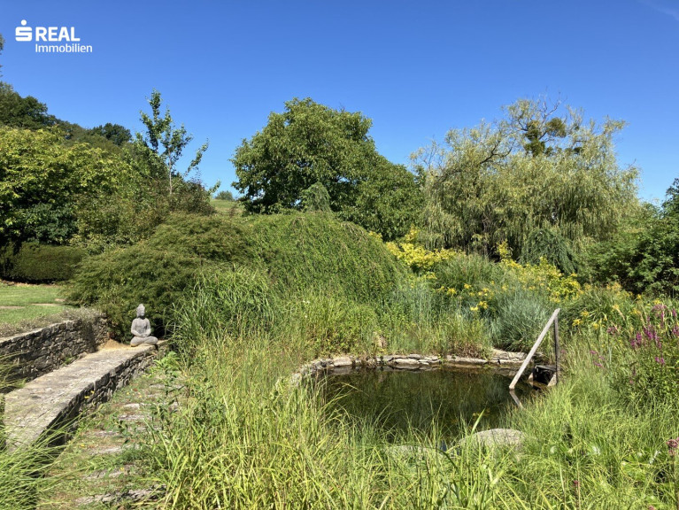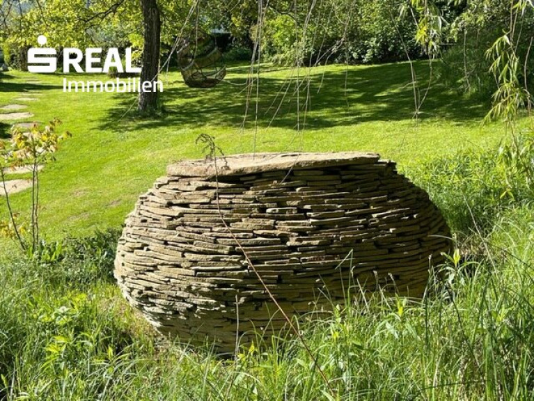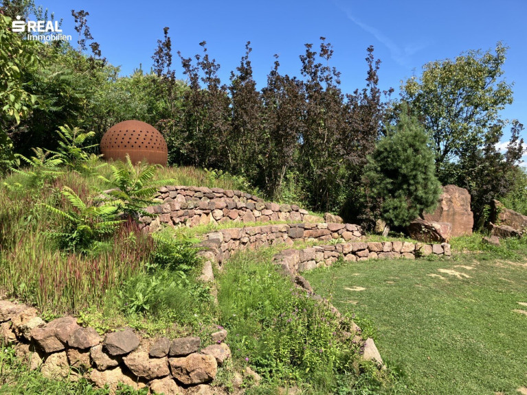 Der ca. 6 Hektar große Garten ist voller idyllischer Plätze, gesäumt von kleinen Teichen und einem sehr großen Schwimmteich mit japanischem Badehaus, Steinskulpturen und harmonisch angelegte Wege und Treppen führen letztendlich zu einem Kraftplatz mit fulminanter Aussicht über das Hügelland des südlichen Burgenlandes. Sie denken enorm viel Arbeit diesen Garten in seiner Pracht zu erhalten, stimmt, aber dafür gibt es einen Gärtner der die Anlage bestens betreut und auch kennt. Es gibt Flächen wo das Gras wachsen darf, damit die Fauna ihr natürliches Dasein haben kann, dafür erhält der Eigentümer eine Förderung. Es ist ein Nullsummenspiel die Förderung bezahlt den einmal in der Woche kommenden Gärtner, also keine Angst sie leben, genießen und der Gärtner steht zur Verfügung. Kleine versteckte Frames bieten im Sommer die Möglichkeit das Wohnen inmitten der Natur, hautnah zu erleben, hören und fühlen. Im Einklang mit der Natur, ein Erlebnis der ganz besonderen Art.