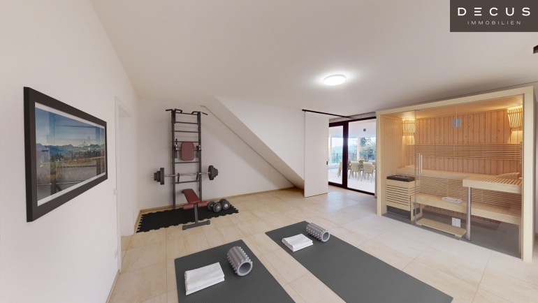 • Wellness: Ein großzügiger überdachter Wellness-Bereich im Untergeschoss mit Pool und Terrasse lädt zum Entspannen ein.