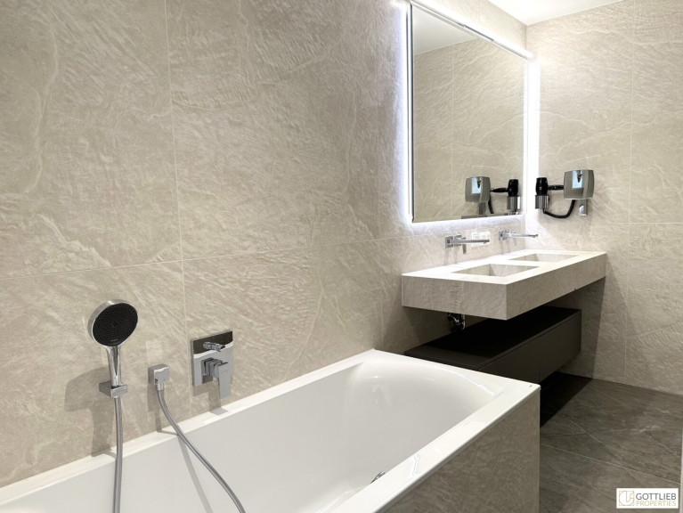+ Bad mit maßgefertigter Dusche, Badewanne, Doppelwaschbecken mit Unterschrank und beleuchtetem Spiegel