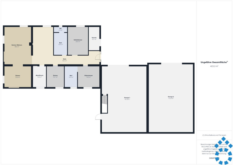 Auf einer Wohnfläche von rund 202,90 m² im Erdgeschoss sowie einer beeindruckenden Garage mit ca. 220,20 m² bietet die Immobilie reichlich Raum für individuelles Wohnen und komfortables Leben für die ganze Familie.