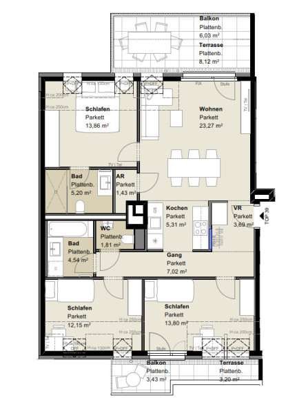 Fliesen, Parkett, Einbauküche, Westbalkon, Dusche