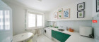 Die Wohnung ist ausgestattet mit Parketten, einer Einbauküche inklusive Waschmaschine, einem Badezimmer mit qualitativ hochwertigen Materialien, Badewanne, Bidet und Waschtisch. Die Einrichtung der beiden Zimmer sind als Wohnbeispiele gedacht, der Verkauf erfolgt unmöbliert.