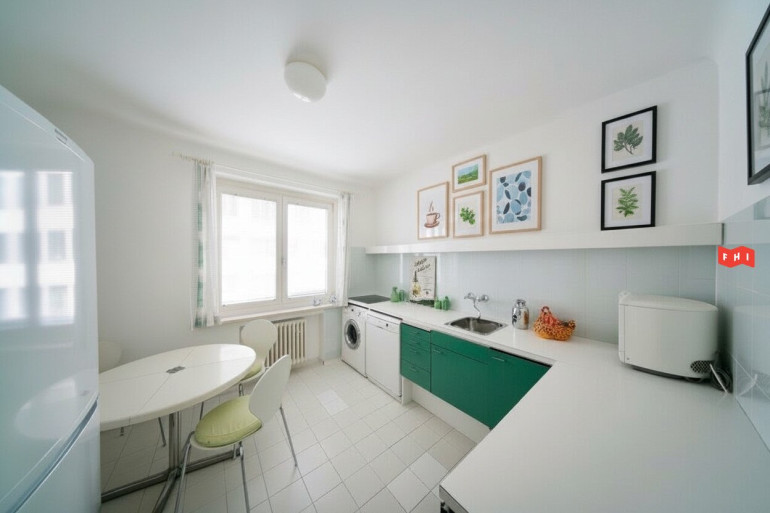 Die Wohnung ist zentral aufgeteilt mit Vorraum, Küche mit Eßplatz, Mittelraum, Wohnzimmer mit Loggia und integriertem Sonnenschutz, Badezimmer und hofseitigem Schlafzimmer. Die beiden Zimmer sind südost (Wohnzimmer) und nordwest (Schlafzimmer) ausgerichtet.