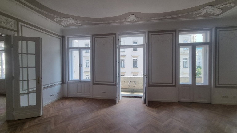 Bei der Sanierung wurde nicht nur auf die verwendeten Materialen Bedacht genommen, sondern im Speziellen auch auf die traumhafte Stuckatur, die originalgetreuen Einbaumöbel im Eingangsbereich sowie die Doppelflügeltüren mit Glasfüllung.