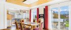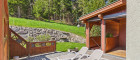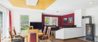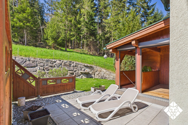 Vom Wohnzimmer aus gelangt man direkt in den traumhaften Garten mit windgeschützter Laube und dem Whirlpool mit Panoramablick – ein echtes Juwel.
