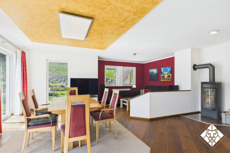 Der offene Wohn- und Essbereich ist das Herzstück des Hauses – ausgestattet mit hochwertigem, geöltem Parkett und einem gemütlichen Schwedenofen für kalte Winterabende.