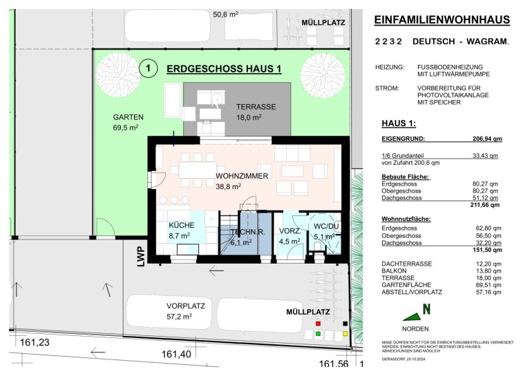 Haus 1: 152m2 Wohnfläche, 69,5m2 Garten, 18m2 Terrasse