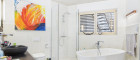 Das Hauptschlafzimmer ist direkt mit Schrankraum und Bad verbunden. Eine Glaswand trennt die Bereiche optisch, lässt sich bei Bedarf aber einfach ersetzen – für alle, die Privatsphäre bevorzugen.