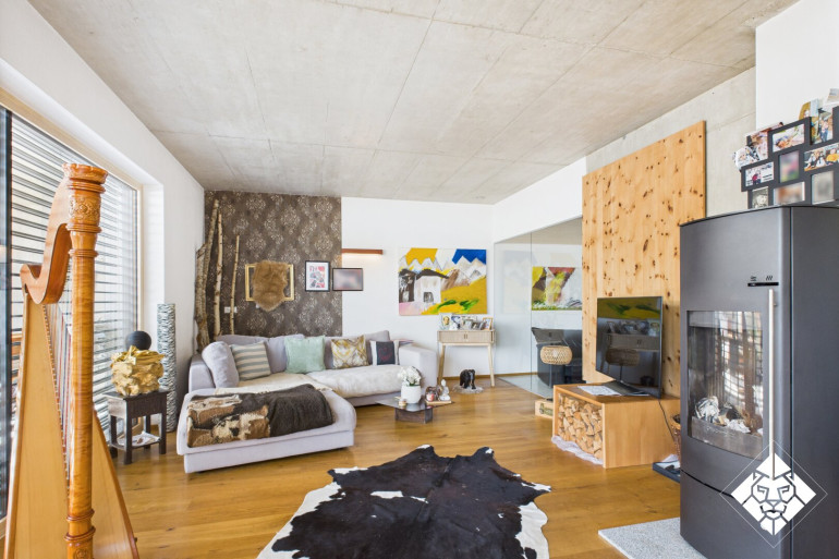 Der Eingangsbereich öffnet sich zu einem offenen Wohn-, Ess- und Küchenbereich mit großen Fensterflächen. Sichtbeton, Holz und Tageslicht prägen die Atmosphäre. Ein wasserführender Kaminofen sorgt für Wärme und unterstützt gleichzeitig die Heizung.