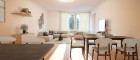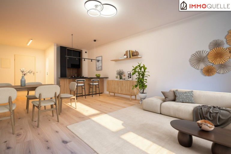 Das Zentrum der Wohnung bildet der offene Wohn- und Essbereich mit angeschlossenen Küchenbereich. Großzügig dimensioniert, bietet dieser Raum Platz für Ihre Wohnideen – ob als stilvoller Rückzugsort oder gesellige Lounge für Gäste. Der hochwertige Eichenparkett in „Country Montreal“ unterstreicht die warme Atmosphäre und schafft ein behagliches Wohngefühl.