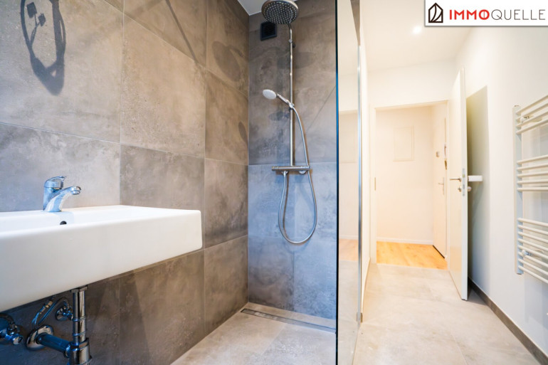 Bereits beim Betreten der Wohnung empfängt Sie ein einladender Flur, von dem aus sich alle Räume logisch erschließen. Zur Linken befindet sich das stilvoll geflieste Badezimmer mit begehbarer Regendusche und hochwertigen Grohe-Armaturen – ein Raum, der Funktionalität mit moderner Ästhetik verbindet. Direkt daneben liegt das separate WC – praktisch platziert.