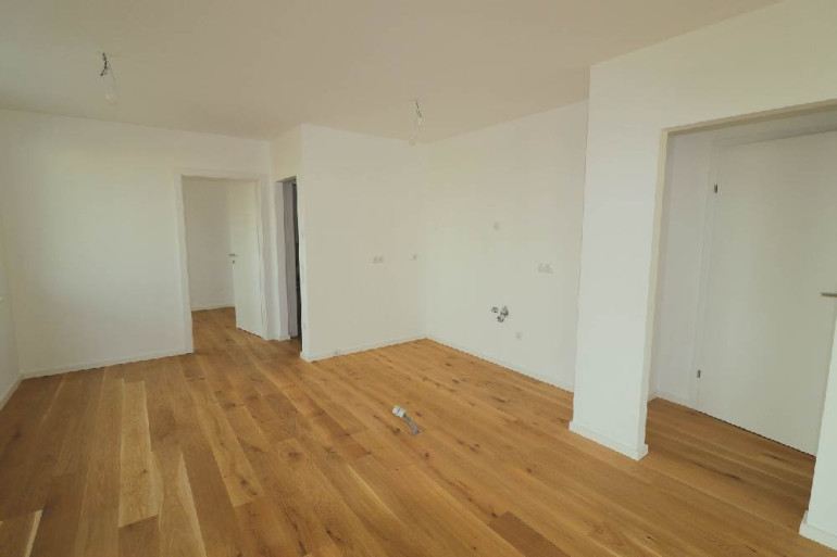 Böden: Hochwertiger Echtholzparkett in Wohnräumen, Feinsteinzeugfliesen in Bad, WC und Vorraum