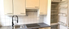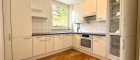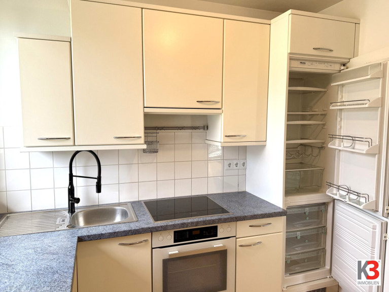 - Küche - Die Küche mit ihren hellen Fronten und der dunklen Arbeitsplatte ist derzeit vom Ess-/Wohnbereich getrennt. Ein Fenster sorgt auch in diesem Raum für Tageslicht.