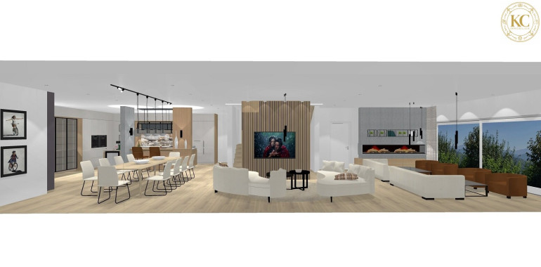 Das Hauptgeschoß, mit einer Fläche von ca. 130 m², wurde als großzügiger Wohnraum mit offener Küche konzipiert. Dank der großen Fensterflächen und der südwestlichen Ausrichtung ist der Raum besonders sonnig und lichtdurchflutet. Von hier aus gelangen Sie direkt auf Ihre Terrasse mit Garten und Pool – der ideale Ort, um mit Familie, Freunden und Gästen das Leben in vollen Zügen zu genießen.