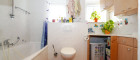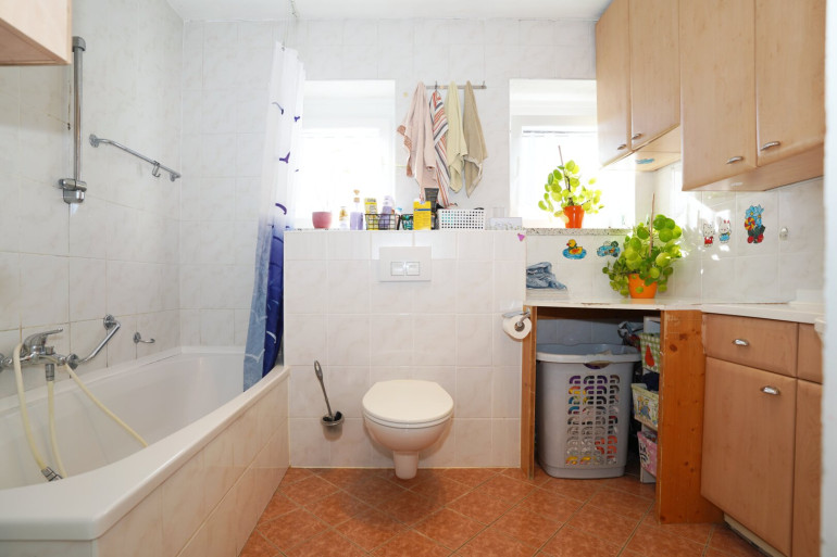+ Badezimmer mit Badewanne, Waschtisch, WC & Fenster