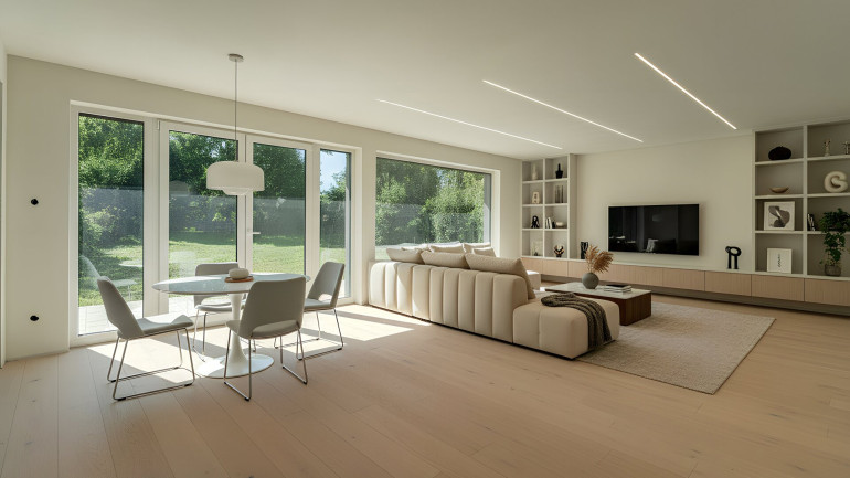 Der Wohn-Essbereich ist lichtdurchflutet und bietet durch große Fensterfronten ein besonderes Wohngefühl. Moderne LED-Lichtschienen im Wohnzimmer setzen stilvolle Akzente. Die Küche ist großzügig geplant und verfügt über eine angrenzende Speis.