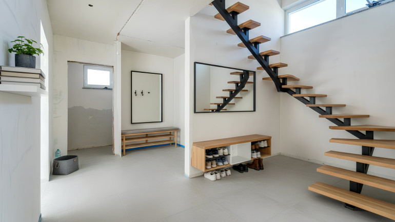 Der großzügige Empfangsbereich öffnet sich zum Wohn-Essbereich, zur Küche sowie zum Obergeschoss.