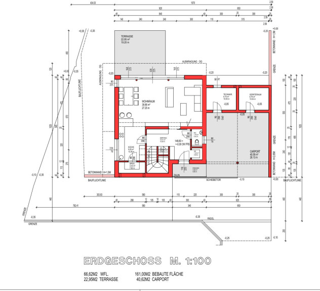Über die Einfahrt gelangt man rechterhand zum optisch ansprechenden Carport, das Platz für zwei Fahrzeuge bietet. Dahinter befinden sich ein Technikraum sowie ein Abstellraum, ideal für Fahrräder oder Gartengeräte.