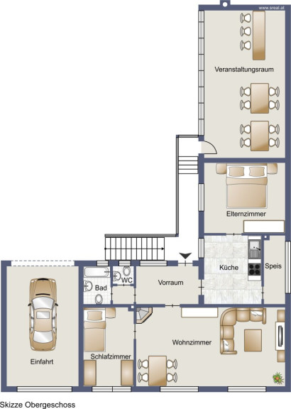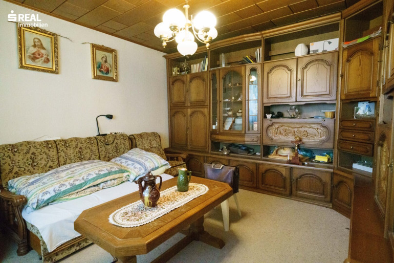 Über einen Treppenaufgang gelangen Sie in das Wohngeschoß mit zentralen Vorraum und Zugang zu Bad und Toilette, sowie den großen Wohnzimmer (welches für ein drittes Schlafzimmer noch unterteilt werden könnte) und dem eigentlichen Schlafzimmer, sowie auf der anderen Seite zur Küche mit Speiskammer und dem dritten Zimmer. Vom Treppenaufgang oben geht es auch direkt zum 60m² großen Partyraum hinüber, so ist alles auf der Wohnebene erreichbar.