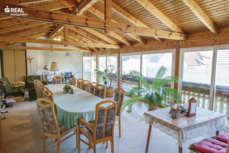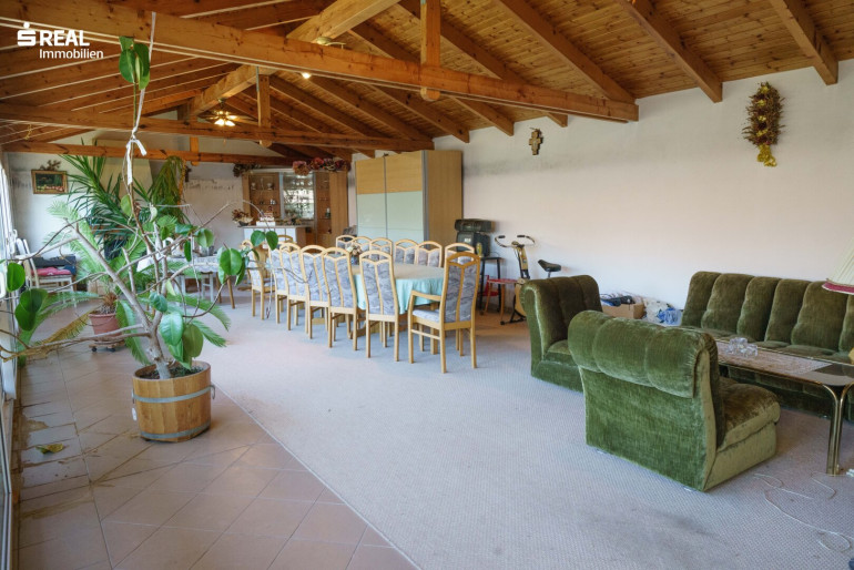 Dieses große Gebäude aus dem Jahre 1962 war früher ein Bauernhof (Schuppen allerdings aus dem Jahre 1930) mit Schankbetrieb im Keller (100m²) und wurde 1990 durch einen Zubau mit 60m² Partyraum erweitert, da immer wieder große Veranstaltungen stattgefunden haben. Mit 38cm dicken Ziegelwänden außen und 25cm bis 12cm Ziegelwänden innen, ist das Gebäude sehr massiv gebaut worden und befindet sich in einer ruhigen Straße, nach Südosten an der Front und Nordwesten innenhofseitig ausgerichtet.