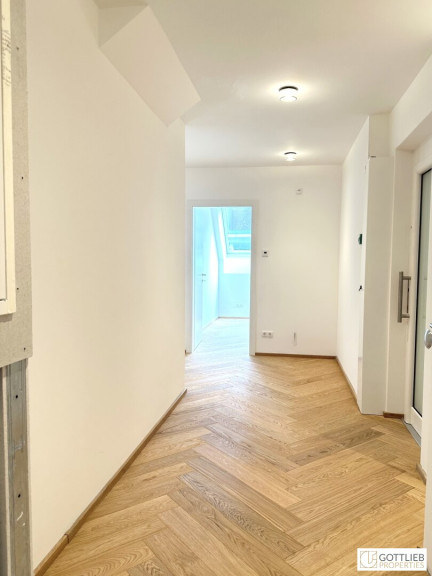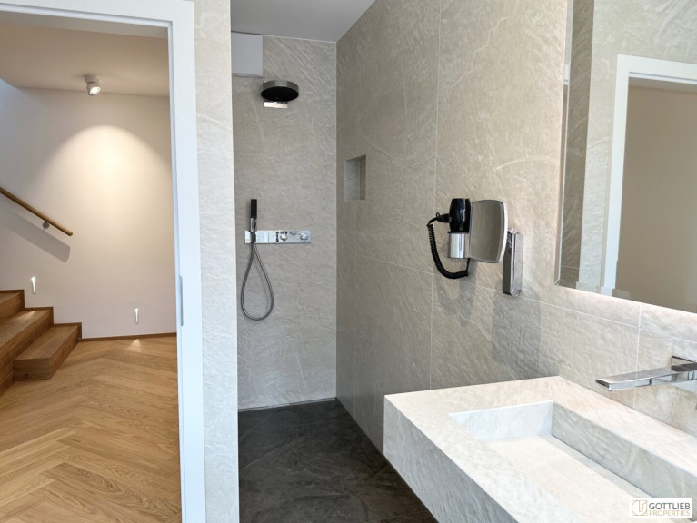 Man betritt die Wohnung über den Vorraum und gelangt von hier aus zentral in die drei Schlafzimmer, ein Wellness-Tageslicht-Bad, ein weiteres Bad, die zwei separaten Toiletten mit Handwaschbecken sowie auf den hofseitigen Balkon. Mit dem Heimlift oder über den geräumigen Treppenaufgang erreicht man sowohl das Obergeschoss als auch die Dachterrasse.