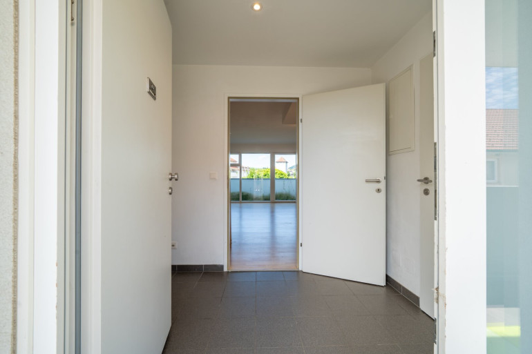 Im 1. Obergeschoss befinden sich ein Vorzimmer, ein WC, ein Abstellraum und ein geräumiges Wohnzimmer mit optimal integrierter Kochnische. Vom Wohnzimmer gelangt man direkt auf den herrlichen Balkon.