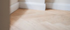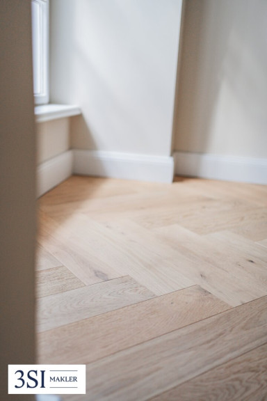 - Fischgrätparkett in Eiche, lebhaft astig, gebürstet, weiß geölt