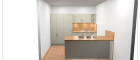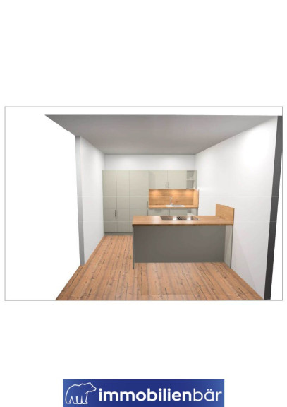 Die Wohnung wird mit einer hochwertigen Einbauküche ausgestattet: Fronten in elegantem Platingrau, schwarze Metallgriffe und eine Arbeitsplatte in Chalet Eiche sorgen für ein modernes, harmonisches Gesamtbild.