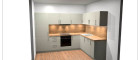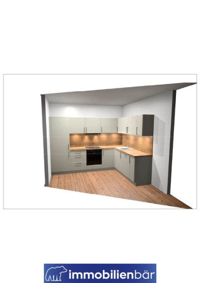 Die Wohnung wird mit einer hochwertigen Einbauküche ausgestattet: Fronten in elegantem Platingrau, schwarze Metallgriffe und eine Arbeitsplatte in Chalet Eiche sorgen für ein modernes, harmonisches Gesamtbild.