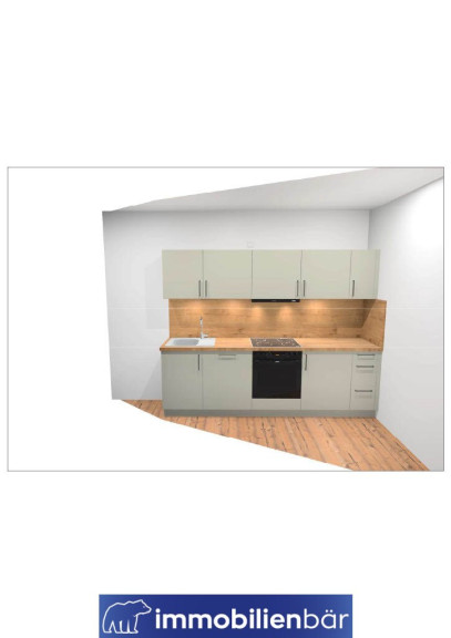 Die Wohnung wird mit einer hochwertigen Einbauküche ausgestattet: Fronten in elegantem Platingrau, schwarze Metallgriffe und eine Arbeitsplatte in Chalet Eiche sorgen für ein modernes, harmonisches Gesamtbild.