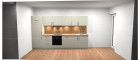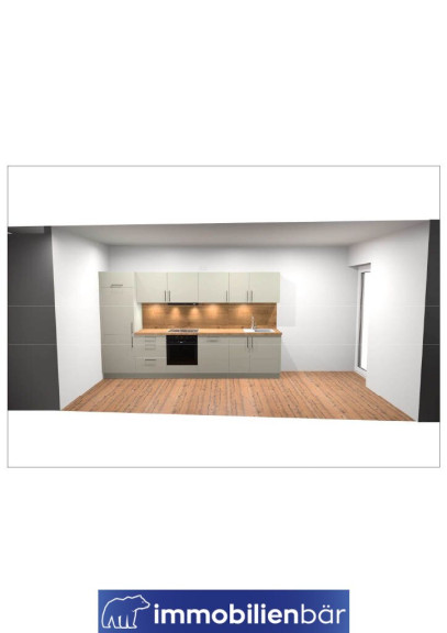 Die Wohnung wird mit einer hochwertigen Einbauküche ausgestattet: Fronten in elegantem Platingrau, schwarze Metallgriffe und eine Arbeitsplatte in Chalet Eiche sorgen für ein modernes, harmonisches Gesamtbild.