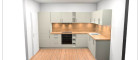 Die Wohnung wird mit einer hochwertigen Einbauküche ausgestattet: Fronten in elegantem Platingrau, schwarze Metallgriffe und eine Arbeitsplatte in Chalet Eiche sorgen für ein modernes, harmonisches Gesamtbild.