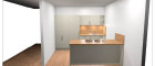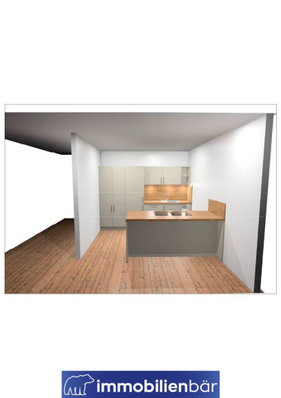 Die Wohnung wird mit einer hochwertigen Einbauküche ausgestattet: Fronten in elegantem Platingrau, schwarze Metallgriffe und eine Arbeitsplatte in Chalet Eiche sorgen für ein modernes, harmonisches Gesamtbild.