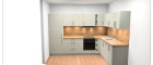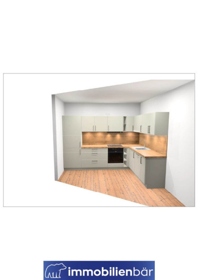 Die Wohnung wird mit einer hochwertigen Einbauküche ausgestattet: Fronten in elegantem Platingrau, schwarze Metallgriffe und eine Arbeitsplatte in Chalet Eiche sorgen für ein modernes, harmonisches Gesamtbild.
