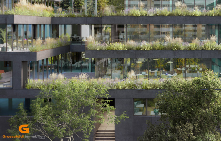 Unter dem Titel "QUARTERA TERRACE, "Naturraum trifft Urbanität" entstehen ca. 4.000 m² anspruchsvolle, nachhaltige Büro-/Dienstleitungs- und Geschäftsflächen mit großzügigen Terrassen in einem 6-geschoßigem Baukörper mit eindrucksvollem Architekturkonzept und nachhaltiger Ausrichtung mit Landmark Funktion.