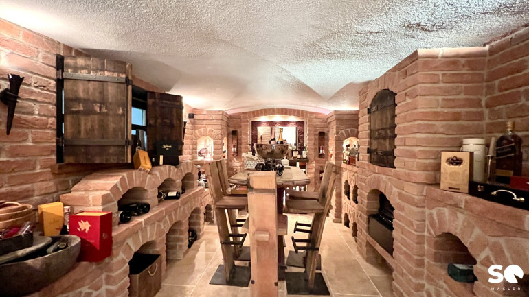 Im Kellergeschoss befinden sich praktische Räumlichkeiten wie eine Garage für zwei Fahrzeuge, ein Hauswirtschaftsraum, ein Abstellraum sowie ein gemütlicher Weinkeller. Ein Gästezimmer mit Dusche und WC sowie eine Sauna runden das Angebot ab.