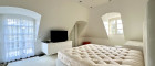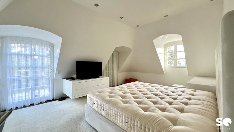 Das Obergeschoss umfasst eine Diele, eine Ankleide, ein geräumiges Schlafzimmer mit Zugang zu einem Balkon, ein Badezimmer und ein weiteres Gästezimmer.