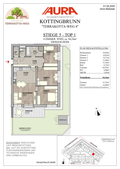 Unsere Wohnungen im Terrakotta-Weg sind so gestaltet, dass Sie sich von Anfang an wohlfühlen werden. Jede Einheit ist schlüsselfertig und mit hochwertigen Laminatböden sowie modernen Bädern ausgestattet. Die Fußbodenheizung ist in allen Zimmern regelbar und sorgt für ein behagliches Wohngefühl. Die großzügigen Freiflächen laden zum Entspannen und Genießen der Natur ein. Dank Fernwärme und energieeffizienter Bauweise leben Sie nicht nur komfortabel, sondern auch nachhaltig!