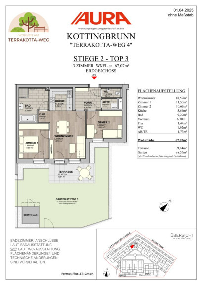 Unsere Wohnungen im Terrakotta-Weg sind so gestaltet, dass Sie sich von Anfang an wohlfühlen werden. Jede Einheit ist schlüsselfertig und mit hochwertigen Laminatböden sowie modernen Bädern ausgestattet. Die Fußbodenheizung ist in allen Zimmern regelbar und sorgt für ein behagliches Wohngefühl. Die großzügigen Freiflächen laden zum Entspannen und Genießen der Natur ein. Dank Fernwärme und energieeffizienter Bauweise leben Sie nicht nur komfortabel, sondern auch nachhaltig!