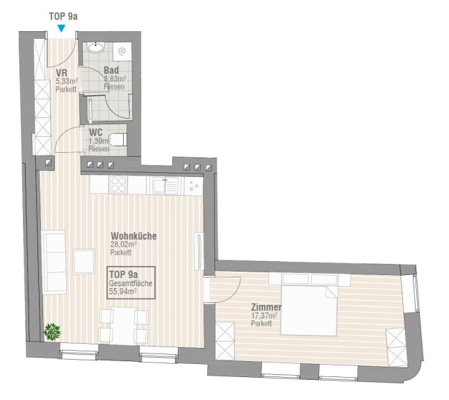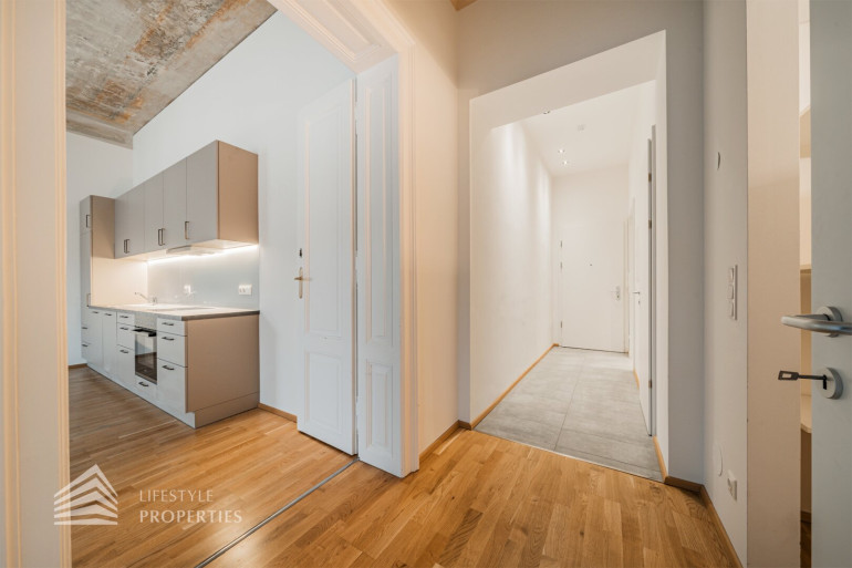Sie betreten die elegante Wohnung, mit einer Größe von ca. 56 m², über einen länglichen Vorraum. Hier finden Sie direkt auf der linken Seite den Zugang zum modernen Bad, welches mit wunderschönen Fliesen verziert ist. Etwas weiter, ebenfalls auf der linken Seite, finden Sie ein separates WC. Das Highlight der Wohnung ist die geräumige, helle Wohnküche mit ca. 28 m². Zwei große Fenster bringen sehr viel Licht in die Wohnung, wodurch sie äußerst freundlich und einladend wirkt. Das Schlafzimmer erreichen Sie über den Wohnraum und misst eine Fläche von ca. 17 m². Drei Fenster sorgen für viel Tageslicht im Raum.