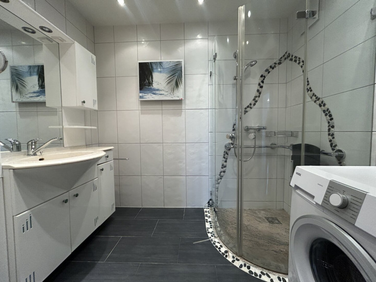 Gegenüber der Schlafzimmer befinden sich das modernisierte Badezimmer mit Dusche, Waschmaschine sowie ein separates WC.